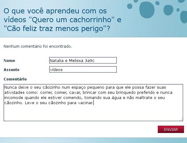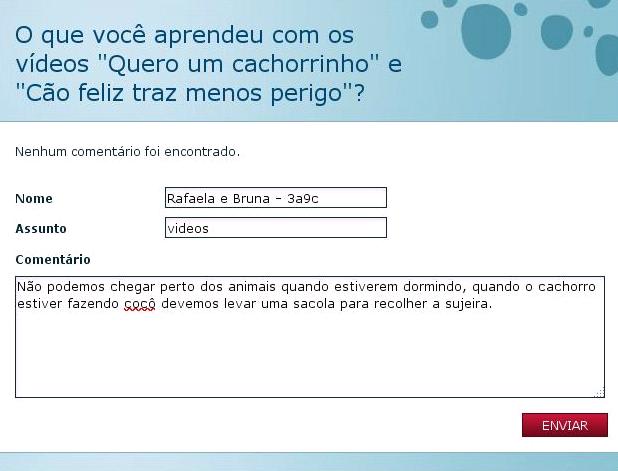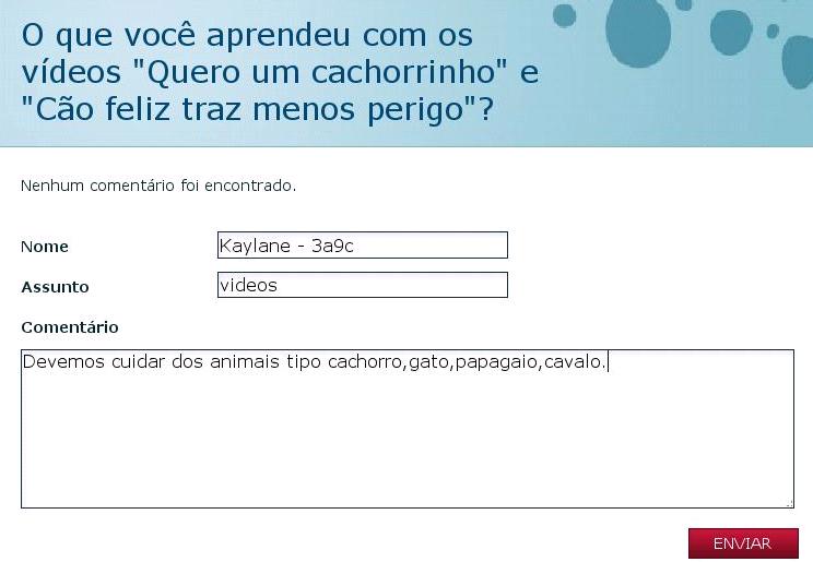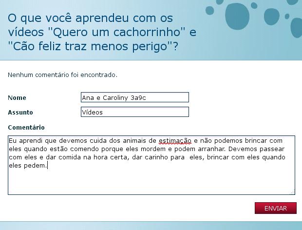 Aprendemos que cuidar dos animais é muito importante. Nós aprendemos que maltratar os bichinhos não pode.