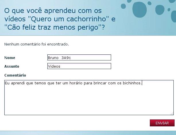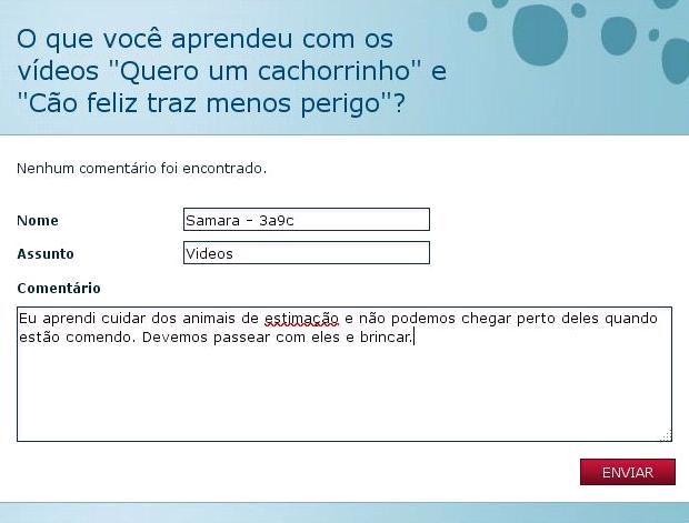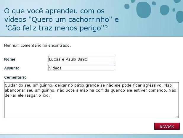 Eu aprendi que tem que cuidar dos animais e levar eles para passear.