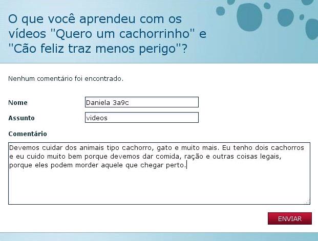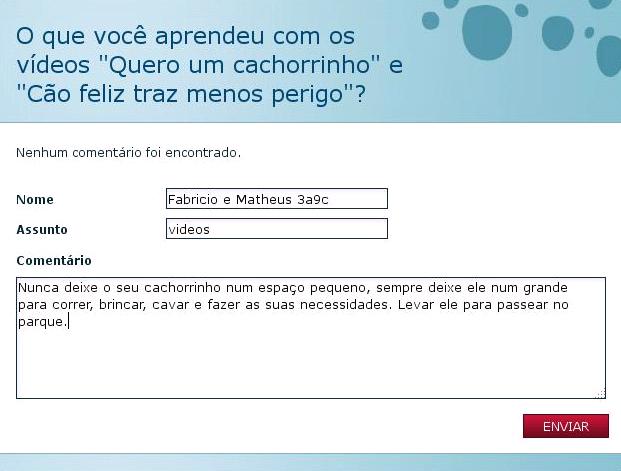 Os dois vídeos ensinam a cuidar e respeitar todos os animais de estimação que existem no mundo, não importa como é o tipo do animal, mas mesmo assim, temos que cuidar com muito amor e carinho dos nossos bichinhos.
